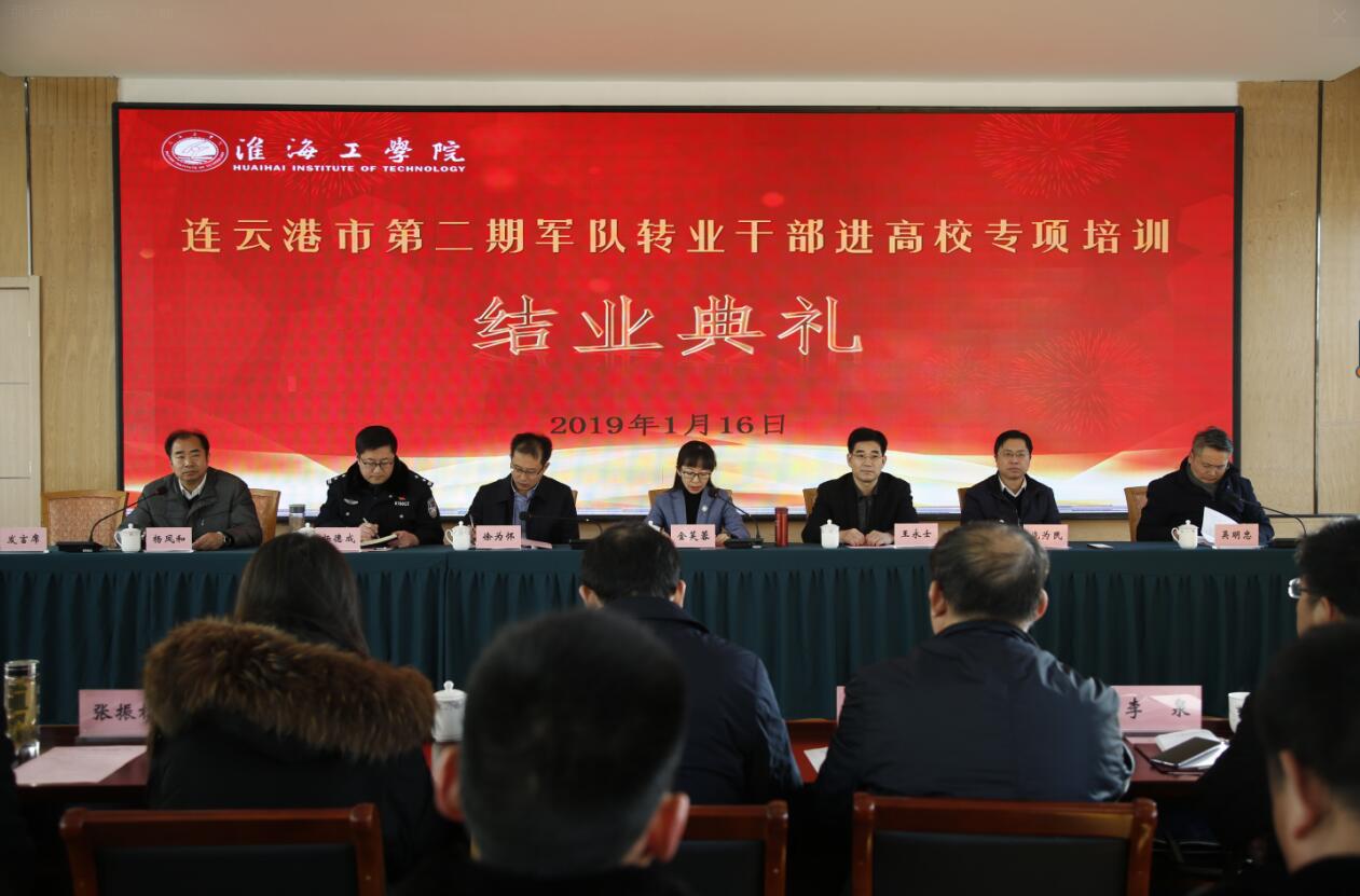 1月16日上午,连云港市第二期军队转业干部进淮海工学院专项培训班结业典礼在通灌校区诚意楼报告厅隆重举行。我校党委常委、副校长金芙蓉,连云港市退役军人事务局局长王永士,连云港市委党建办副主任徐为怀,连云港市财政局副局长施为民,连云港市公安局政治部主任杨德成,我校教学质量管理处处长吴明忠,市委组织部、市公安局、市军转办、市财政局等部局领导,继续教育学院相关管理人员以及第二期军转干学员150余人出席结业典礼。结业典礼由继续教育学院院长杨凤和主持。