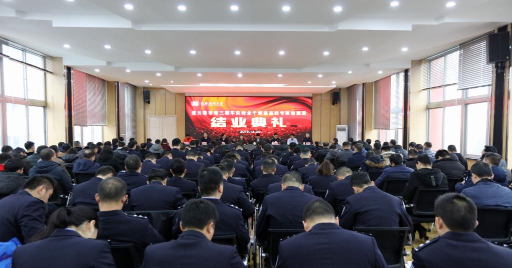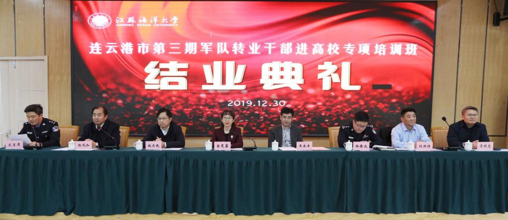12月30日上午,连云港市第三期军队转业干部进江苏海洋大学专项培训班结业典礼在我校通灌校区诚意楼报告厅举行。我校党委常委、副校长金芙蓉,市退役军人事务局局长王永士,市财政局局长施为民,市公安局党委委员、政治部主任杨德成,以及市委组织部等有关部、局同志出席,市第三期专项培训班全体学员和教师代表共170余人参加典礼。