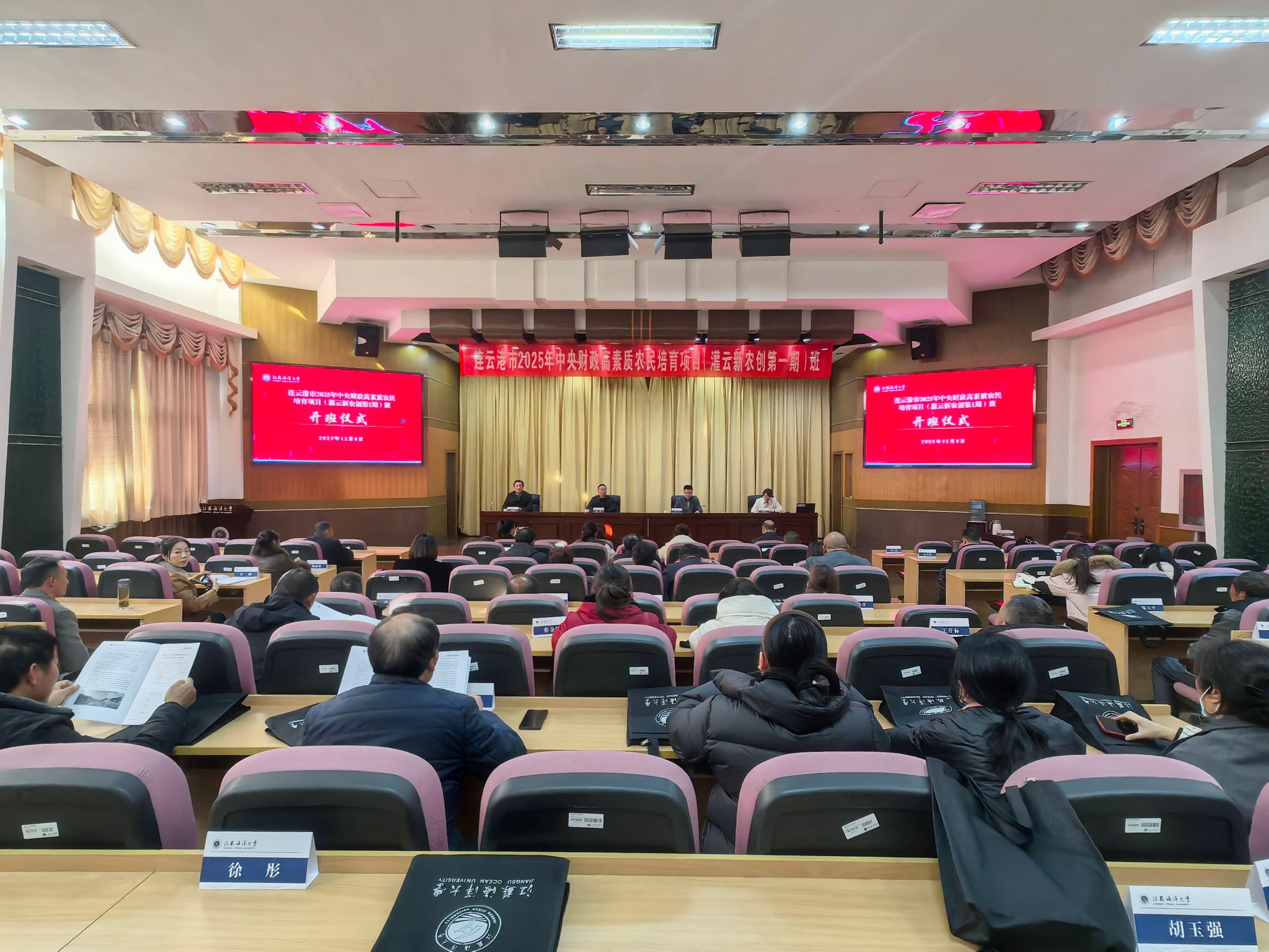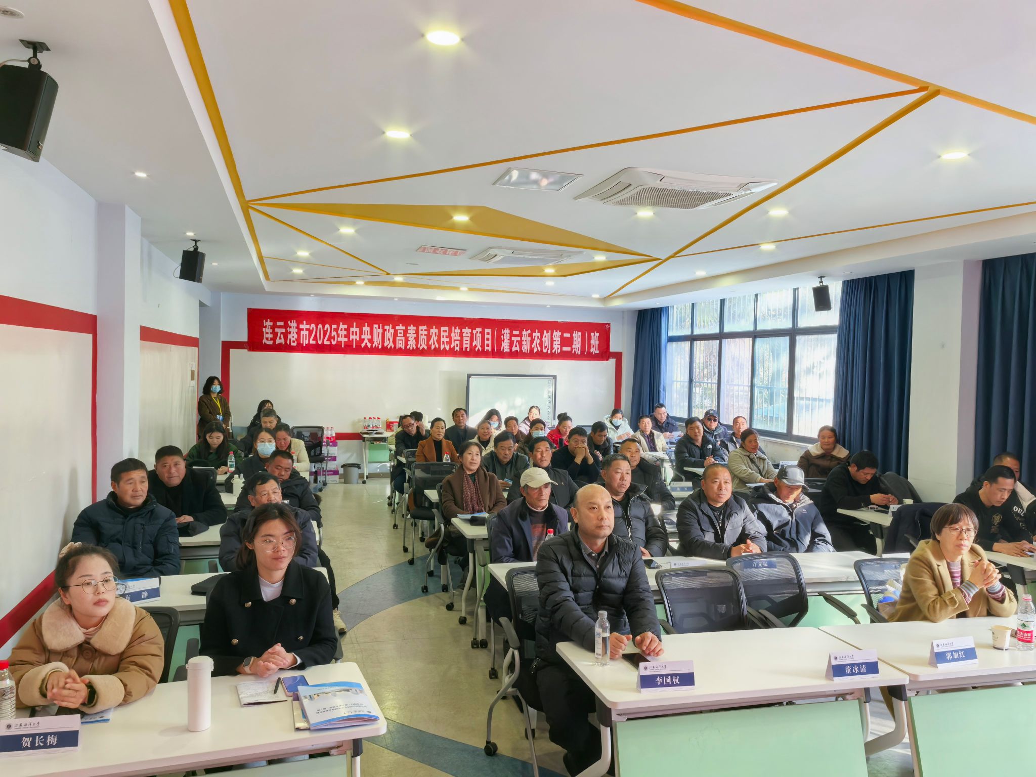 12月8日下午,连云港市2025年中央财政高素质农民培育项目(灌云新农创)培训班在我校苍梧校区文博楼报告厅正式开班。连云港市职业农民培育指导站站长路辉出席开班仪式,继续教育学院副院长陶飞致欢迎辞,灌云县委农村工作领导小组办公室副主任王祖建作开班动员并讲授行政第一课。市职业农民培育指导站、灌云县农业农村局有关人员以及来自灌云县的100 名学员参加开班仪式。