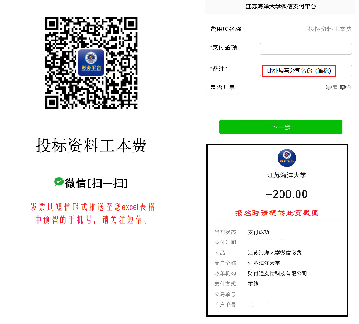 购买招标文件费200元。请用微信扫描下图缴费。投标资料工本费如需开发票,请下载附件:《缴费平台开具电子发票登记簿》,填写完整后将excel版本该文件与报名材料一起发送至指定邮箱,不接受报名结束后补开发票。发票为电子票,发至登记簿中登记的邮箱号。