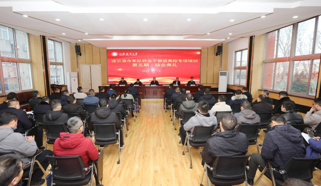 2022年1月14日下午,连云港市第五期军队转业干部进高校专项培训结业典礼在我校通灌校区诚意楼报告厅举行。校党委常委、副校长严云洋,连云港市退役军人事务局党组副书记、副局长徐为怀,连云港市委组织部规划办主任沈怀栋,连云港市公安局政治部人事处处长李泉以及继续教育学院相关人员、第五期军转干全体学员参加了结业典礼。典礼由继续教育学院院长舒伟主持。