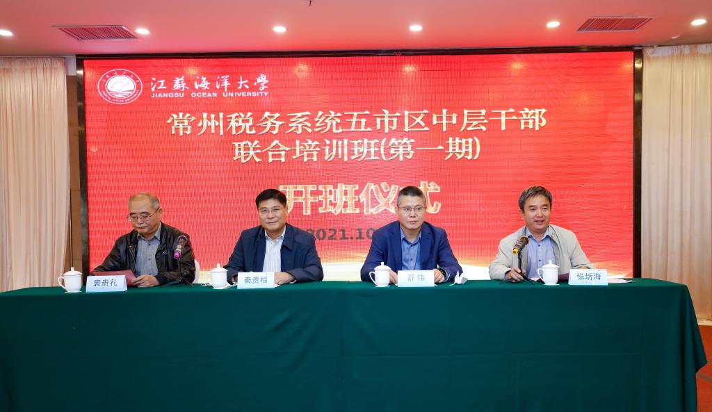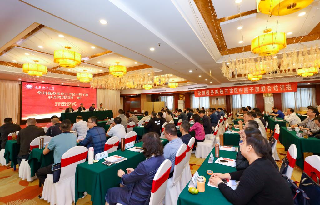 江苏海洋大学继续教育学院承办的常州税务系统五市区中层干部联合培训班于2021年10月11日下午举行开班仪式,来自常州税务系统80多位中层干部参加,继续教育学院院长舒伟出席开班仪式。