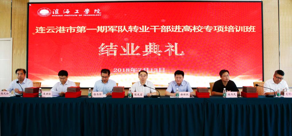 7月13日上午,连云港市第一期军队转业干部进淮海工学院专项培训班结业典礼在通灌校区诚意楼报告厅举行。我校副校长陈先宏,连云港市军转安置工作领导小组副组长、市人社局局长郝新跃,市军转领导小组副组长、中共连云港市委党建办副主任徐为怀,连云港市财政局副局长施为民,市人社局副局长、市军转办主任史洪松,我校质量管理处处长吴明忠,市军转办、市公安局等部局领导及第一期学员80余人出席结业典礼。结业典礼由继续教育学院院长杨凤和主持。