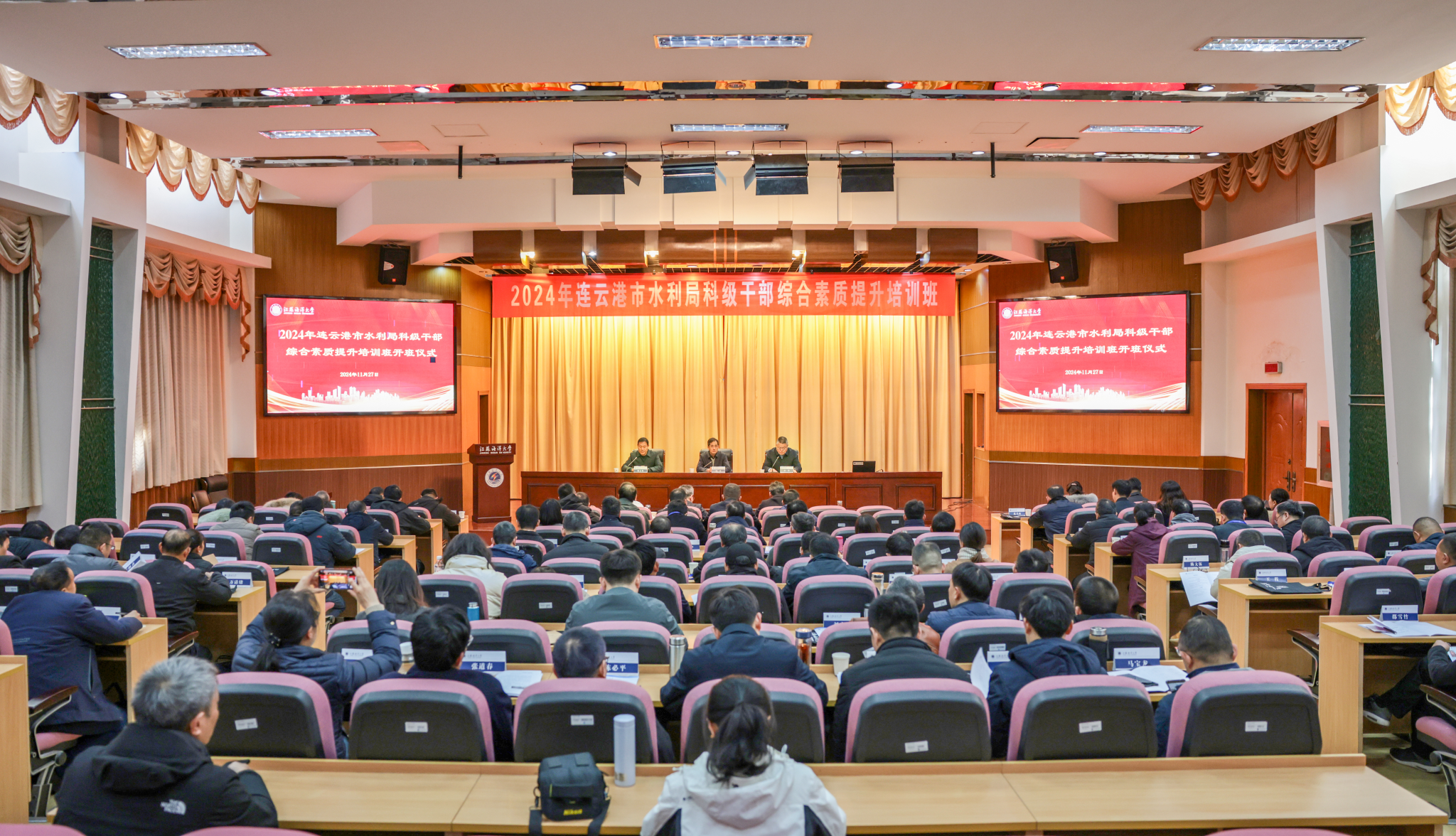 为进一步提升市水利局科级干部的综合素质与业务能力,推动水利事业持续健康发展,11月27日,连云港市水利局科级干部综合素质提升培训班在我校正式开班。连云港市水利局局长、党组书记颜建,我校继续教育学院院长舒伟出席开班仪式,100余名连云港市水利局科级干部参加培训班。